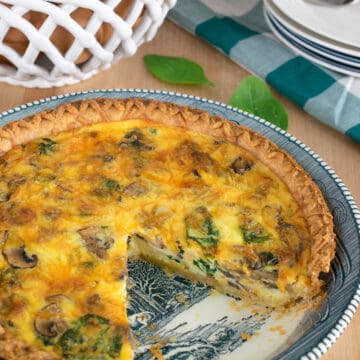With a creamy egg custard, savory veggies, and cheese filling in a flaky pie crust, this easy Spinach Mushroom Quiche recipe is something to wake up for! This easy quiche recipe comes together in one hour or less, making it a go-to quick and easy crowd-pleasing dish!